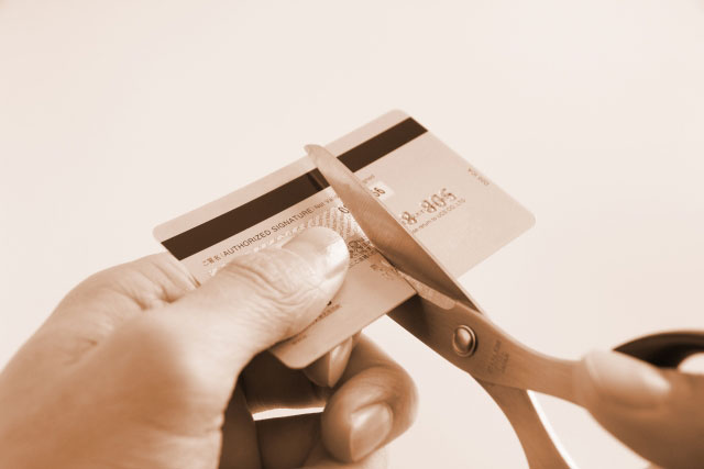 クレジットカードをハサミで切ろうとしている人の手元