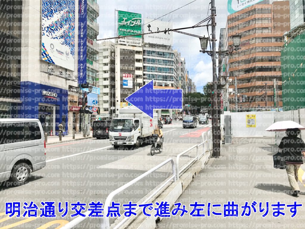 明治通りの交差点まで直進し、交差点を左に進みます。